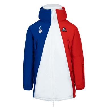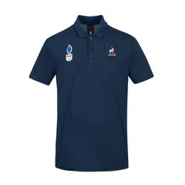 Polo bleu marine floqué du logo Le Coq Sportif et de celui de l’équipe de France aux Jeux Olympiques.