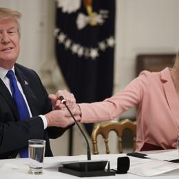 15 mai 2019. Une fois n’est pas coutume, le président des États-Unis a fait preuve de galanterie envers son épouse Melania Trump lors du dîner de l’association historique de la Maison-Blanche. (Washington.)