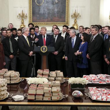 4 mars 2019. Il fallait bien un tel banquet pour satisfaire l’appétit des Bison, une équipe de football reçue par Donald Trump à la Maison-Blanche. (Washington.)