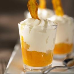 Pour une entrée fracassante, Philippe Conticini met les petits plats dans les grands avec cette verrine de chèvre frais, carottes confites et ananas.