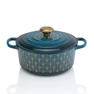 Cocotte ronde Signature fonte émaillée, coloris bleu Deap Teal, 24 cm, 335 €, Le Creuset. En vente sur www.galerieslafayette.com.
