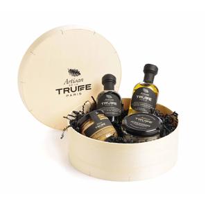 Coffret «Initiation Truffe», contient du vinaigre balsamique à la truffe (100 ml), du sel de Guérande IGP à la truffe d’été (60 g), de l’huile d’olive vierge extra aromatisée à la truffe noire (100 ml), de la crème de parmesan à la truffe d’été (90 g), 45 €, Artisan de la truffe. Disponible dans toutes les boutiques Artisan de la truffe.