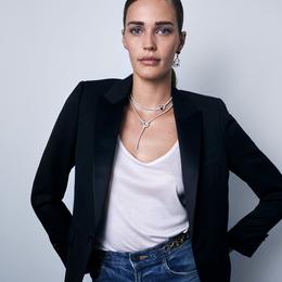 Sofia Resing pour Pomellato boucle d’oreille, Collier et bague Catene, en or blanc et diamants, Pomellato. Caraco et pantalon, Alexander McQueen. Mise en beauté Dior par Fred Marin. Coiffure Leonor Greyl par Fred Barrat.