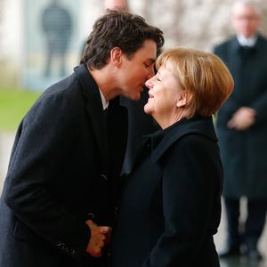 Justin, cet homme à femmes. Ici à l’oreille d’Angela Merkel. (Berlin, 17 février 2017.)
