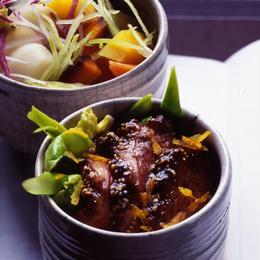 Le classique de la cuisine française est revisité à la Japonaise avec le yuzu, agrume typique du pays du soleil levant, du poivre, du sésame noir et du sirop d’érable.