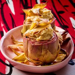 Conseil gourmand : Sarah Gade accompagne ce plat de copeaux d’artichauts crus et de chips de feuilles d’artichaut.