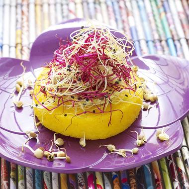 En accompagnement, rien de plus fondant et délicat que cette galette de polenta aux pousses de légumes.
