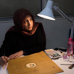 Dans un atelier du centre Ismek de Fatih, Sevilay Ak apprend le « Tezhip », un art calligraphique souvent utilisé pour orner le Coran de dessins dorés. Cette ancienne comptable a quitté son travail pour s’occuper de ses enfants après son mariage. Maintenant qu’ils ont grandi, elle préfère se dédier à l’art, qu’elle juge bien plus épanouissant, et espère vendre par la suite ses décorations. (Istanbul, le 14 février 2020.)