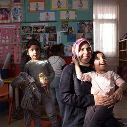 Dans le bâtiment de la coopérative Ilk Adım, soutenue par l’association KEDV, Saime vient chercher son enfant de quatre ans. Cette jeune maman est femme de ménage à temps plein depuis un an, grâce à la crèche où elle peut déposer sa fille Zehra. (Istanbul, le 10 février 2020.)