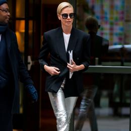 Charlize Theron dans un pantalon argenté et blazer noir dans les rues de New York. (New York, le 12 novembre 2019.)