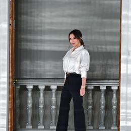 Victoria Bechkam et son combo gagnant : pantalon flare et blouse légère pour son défilé lors de la Fashion Week de Londres. (Londres, le 16 février 2020.)