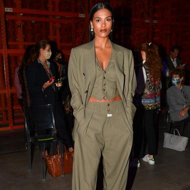 Tina Kunakey au défilé Etr, dans un tailleur pantalon kaki. (Milan, le 23 septembre 2021.)