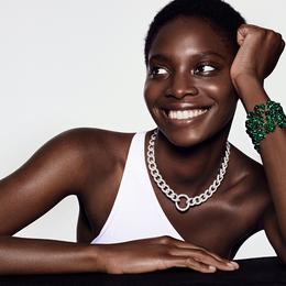 Marie : collier Catene, en or blanc et diamants, collection Haute Joaillerie, Pomellato, bracelet en or blanc et titane, émeraudes taille cabochon et diamants, collection Red Carpet 2021, Chopard. Maillot de bain, Calarena.