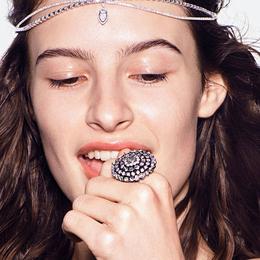 Pauline : bijou de tête Twisted Wave, en or blanc et diamant, collection Messika By Kate Moss opus 2, Messika Paris, bague médaillon Okavango Grace, en or blanc rhodié, diamants bruts et polis, collection Reflections of Nature, De Beers. Maillot de bain, Chlore.