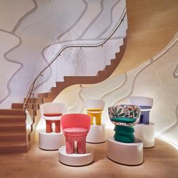 À l’intérieur, un fabuleux escalier central en chêne bordé de verre assure la circulation. Pour filer la métaphore de l’eau, un second escalier, à l’arrière du bâtiment, réinterprète une peinture de Kimiko Fujimura, Wave blue line. Dans les vitrines, d’immenses méduses monogrammées veillent sur le paysage.